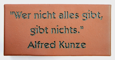 Fanstein - das ProduktFür die Gestaltung von Plätzen, Gehwegen oder Wänden mit personalisierten Klinkersteinen haben wir ein Verfahren entwickelt, das die dauerhafte Beschriftung von mineralischen Erzeugnissen mittels Laser in höchster Qualität ermöglicht. Das Ergebnis: Der Original Fanstein: ![]() Lasergravur bis zu 3 Zeilen Text und/oder Grafik beliebige Grafiken nach Ihren Wünschen beste Witterungs- und Alterungsbeständigkeit Text mit bis zu 18 Zeichen je Zeile bei freier Auswahl des Zeichensatzes alle Abbildungen in hoher Schärfe und hervorragender Qualität.Die Technologie: Mit einem laserbasierten Beschriftungsverfahren wird durch Hitze lokal die Farbe des bestrahlten Steins verändert, ohne dass dessen bauphysikalische Eigen- schaften leiden. Der Vorteil: Die haltbar eingebrachten Grafiken und Schriften sind witterungs- und alterungsbeständig, resistent gegen UV-Strahlung, verblassen nicht und lassen sich ohne Zerstörung der Optik auch in stark frequentierten Bereichen belasten und begehen. Die Perfektion: Die ausschließliche Verwendung von Klinkern aus deutscher Produktion und deren High-Tech-Bearbeitung garantieren eine ausgezeichnete Qualität und kurze Lieferzeiten. Die Optik: Das innovative Laser-Verfahren bietet weit gehende Gestaltungsfreiheit sowie scharfe kontrastreiche Wiedergabe von Schriftzeichen und Grafiken. Die Wirtschaftlichkeit: Trotz der nahezu unbegrenzten Individualisierungsmöglichkeiten ist das computergestützte Laser-Verfahren mit Abstand wirtschaftlicher als jede andere Technologie. Das erlaubt Produktion und Vertrieb von beliebigen - auch kleinen! - Stück- zahlen. |